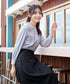 ネックラインは流行りのバンドカラーデザインで、胸元のあきが少ない分、キンちんとした印象を作ってくれるので、お仕事着としても活躍できます。