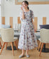 シフォン素材の大きめの花柄が華やかなフレアスリーブのワンピース。